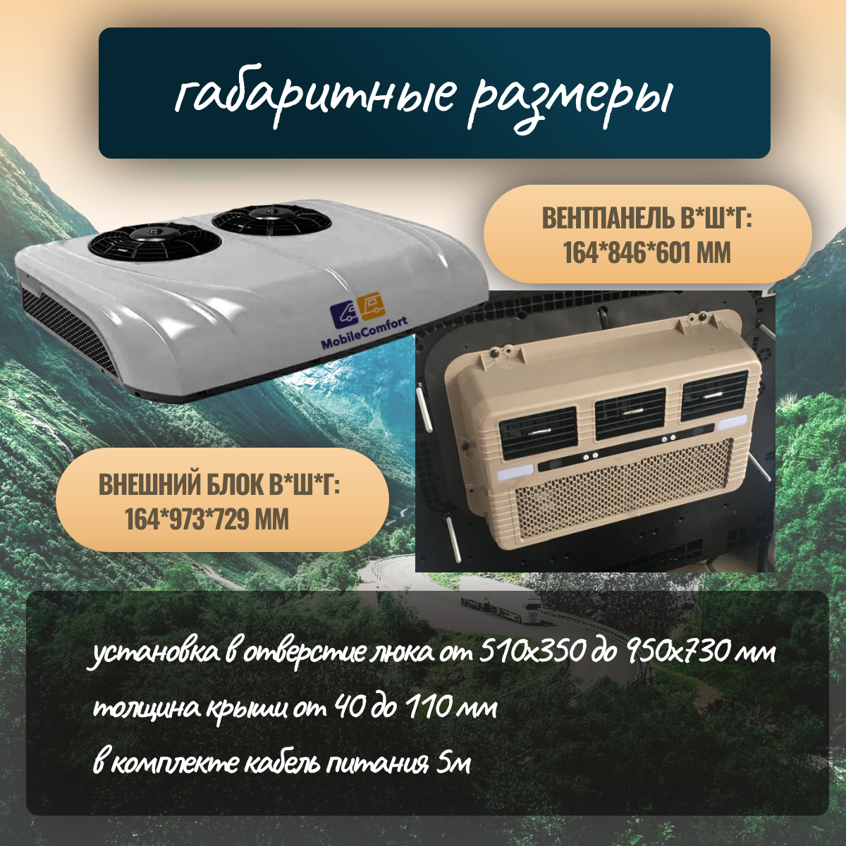 + Герметичные компоненты. Кондиционер не боится попадания влаги - предназначен переносить любое количество осадков. Все внутренние компоненты кондиционера защищены от попадания влаги – не боится проливных дождей, допускается мытьё на автомойке.