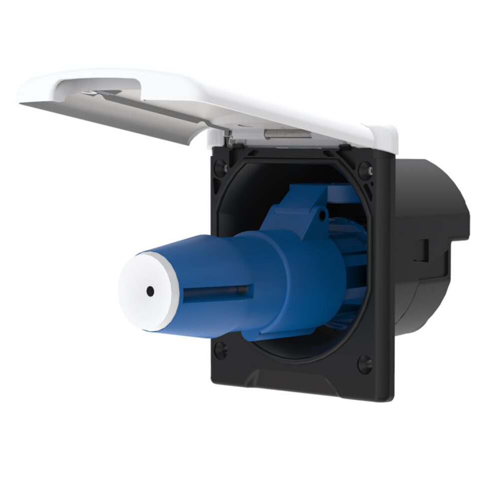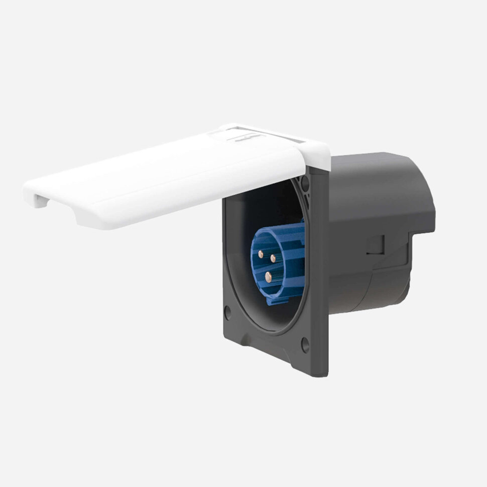 - Внешний вход, 230 В/16 А. Цвет внешней крышки белый. Монтажный размер Ø 96 мм. Ответная часть (вилка) в комплекте.