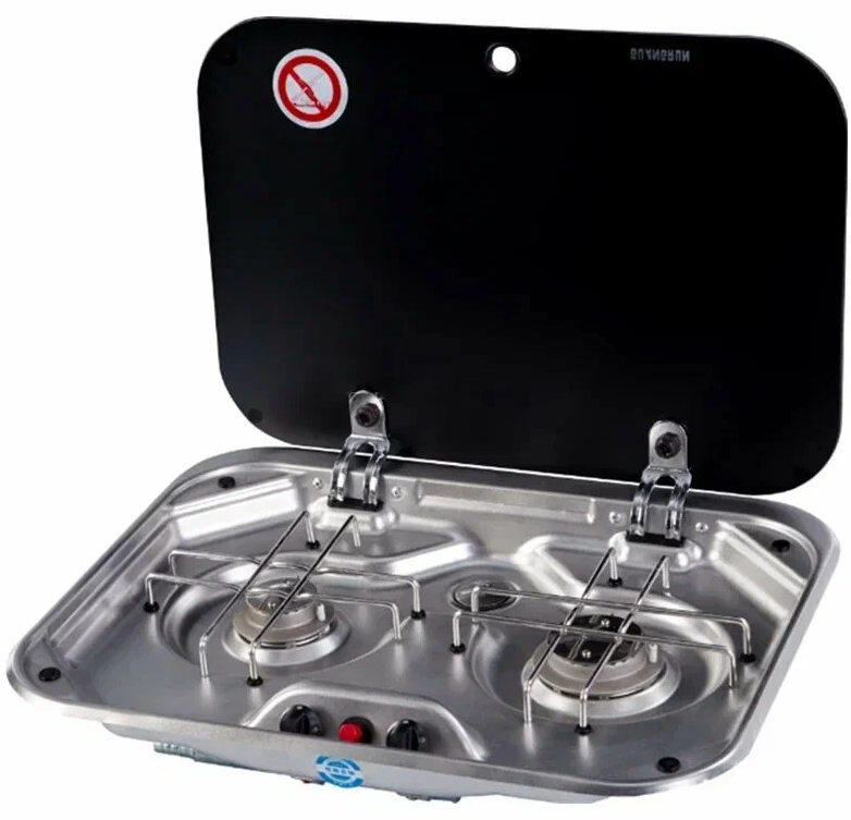 Двухконфорочная модель из прочной нержавеющей стали с элегантной стеклянной крышкой и удобным пьезоподжигом.