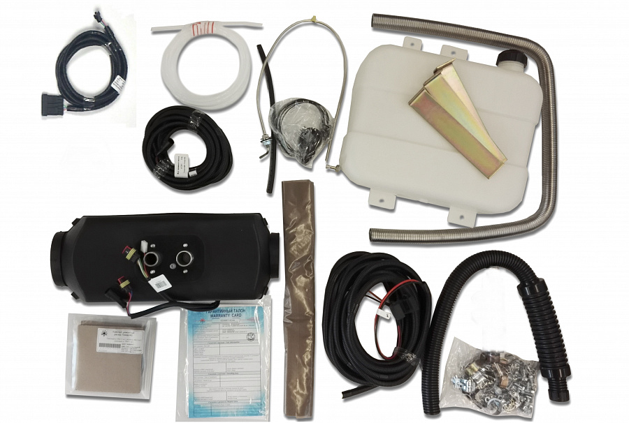 Состав комплекта: Отопитель, пульт управления, топливный насос, топливный бак, топливопровод, соединительные жгуты, воздухозаборник, выхлопная труба, крепеж.