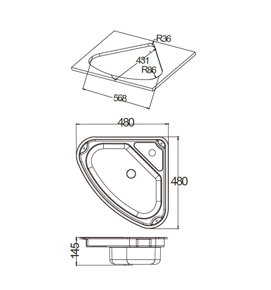 480*480*145 мм треугольная белая акриловая мойка GR-Y007