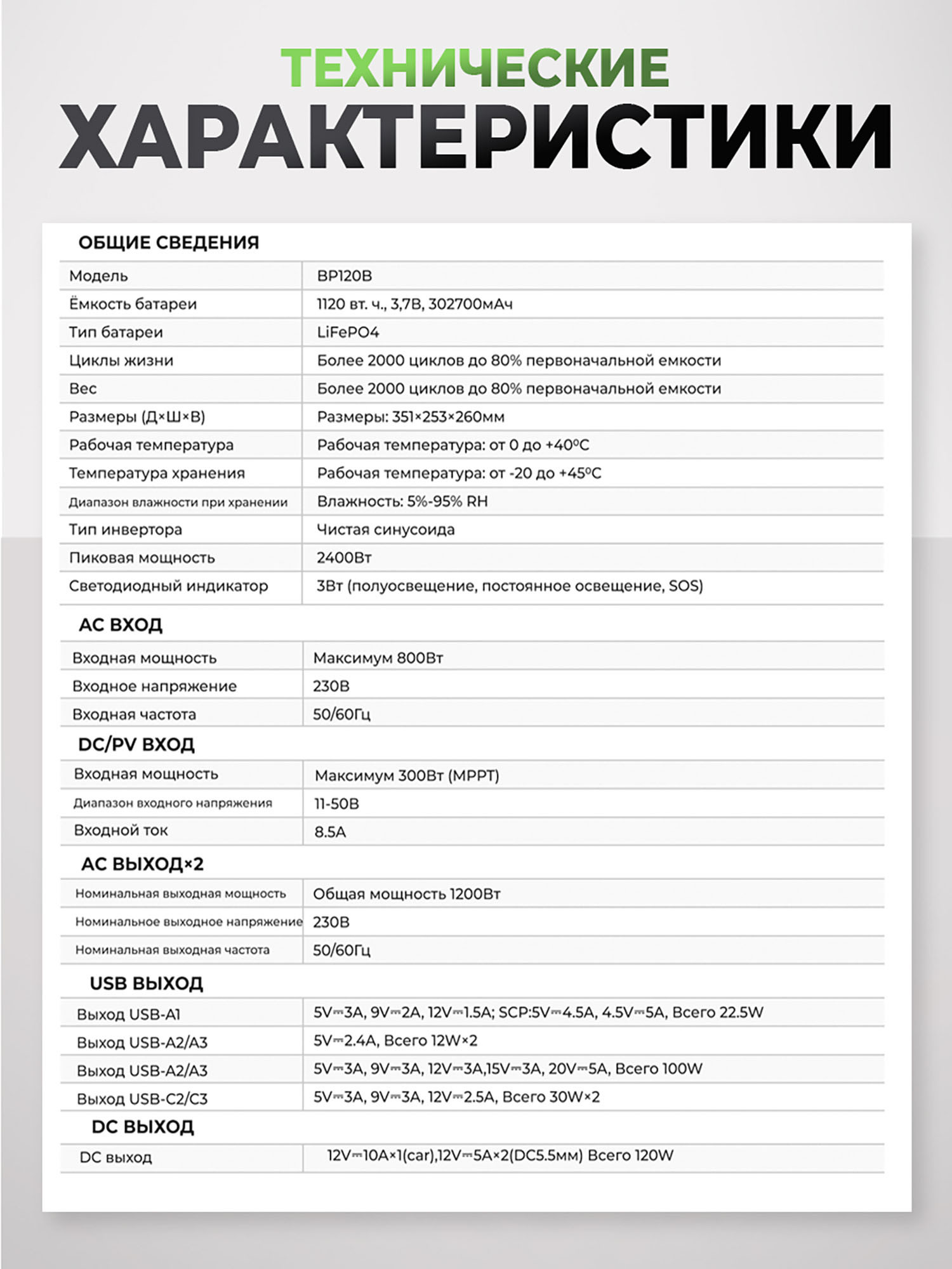 — Порты: 220 В розетки, USB-A/USB-C, 12 В "прикуриватель" и другие.