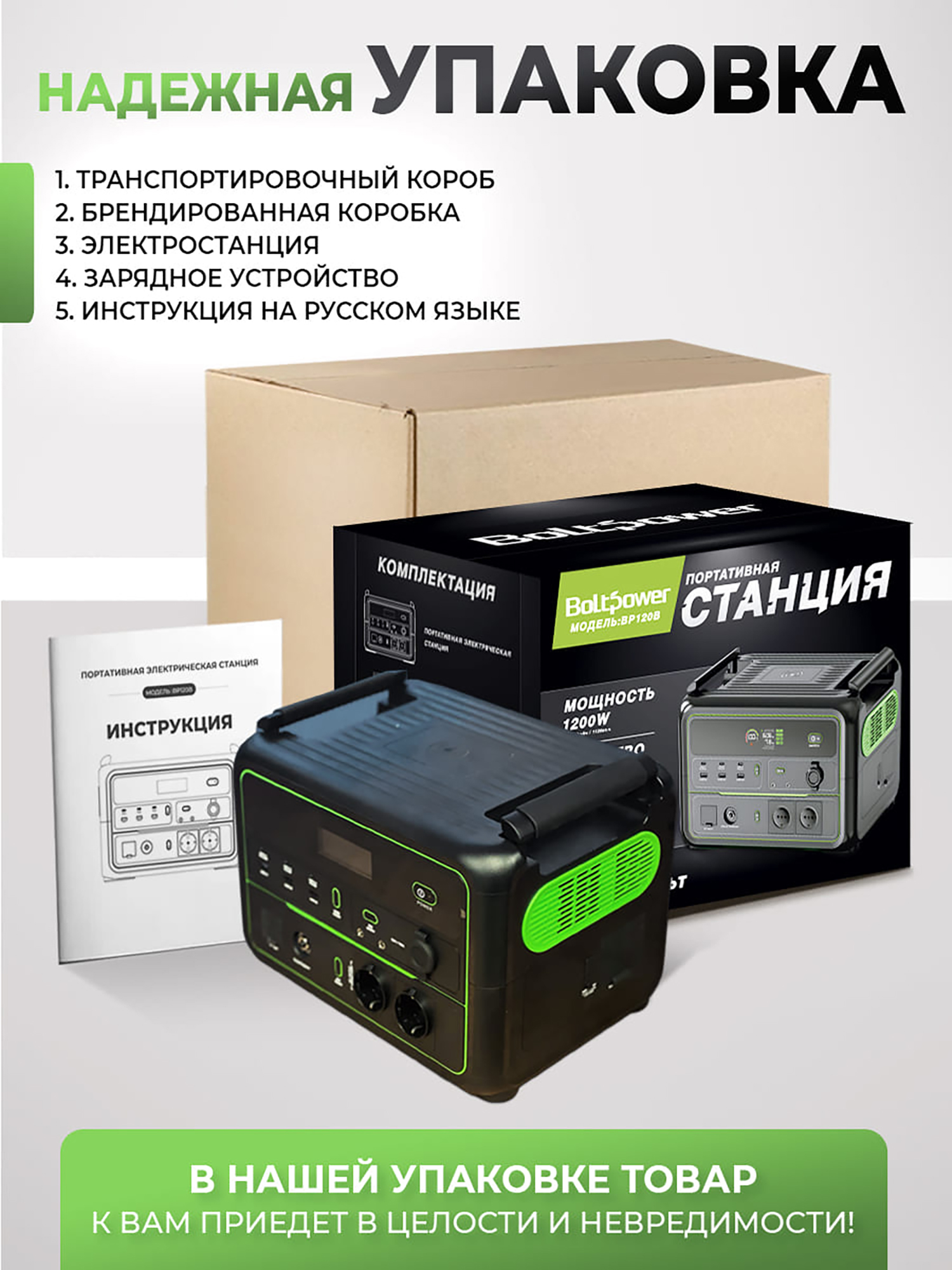 Портативная электростанция Boltpower 1200 MAX электрохранитель домашнего комфорта. Портативная зарядная станция с функцией ИБП мощностью 1200 Вт создана для поддержания работоспособности бытовых приборов (холодильник, телевизор, газовый котёл, чайник и компьютер) в случае аварийного отключения электроэнергии. Станция оснащена LiFePo4 (литиево-железо-фосфатным) аккумулятором, который имеет больший ресурс, чем обычные АКБ. Спустя 2500+ полных циклов заряда и разряда (более 6+ лет ежедневной работы) потеря ёмкости составляет всего 20%.