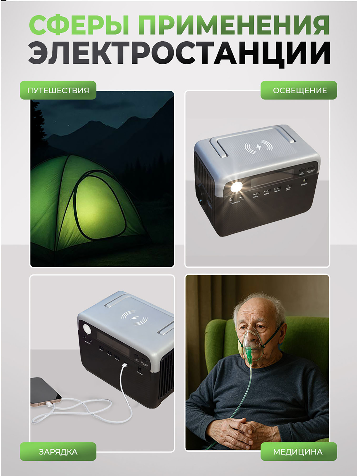 Представьте домашнюю розетку, которую можно взять с собой. Внутри станции — безопасный аккумулятор и электроника, которая превращает запас энергии в обычные 220 В (как в стене). Включаете лампу, телевизор, холодильник, ноутбук, мелкую бытовую технику, смартфоны, фотоаппарат, камеры, дроны, инструменты, планшет — все работает.