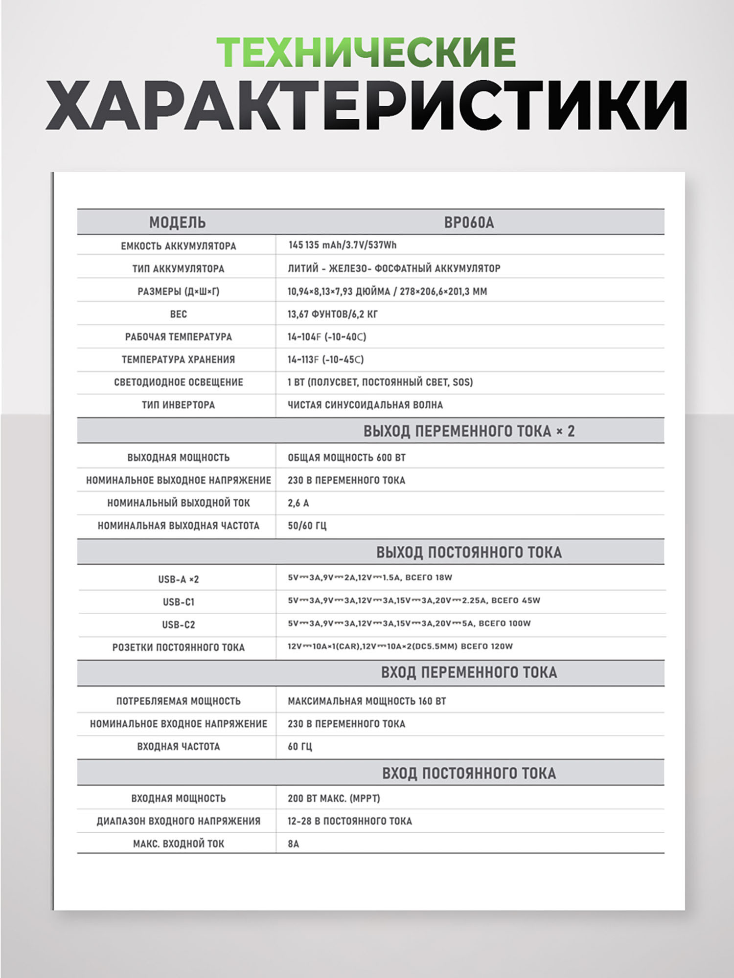 — Порты: 220 В розетки, USB-A/USB-C, 12 В "прикуриватель" и другие.
