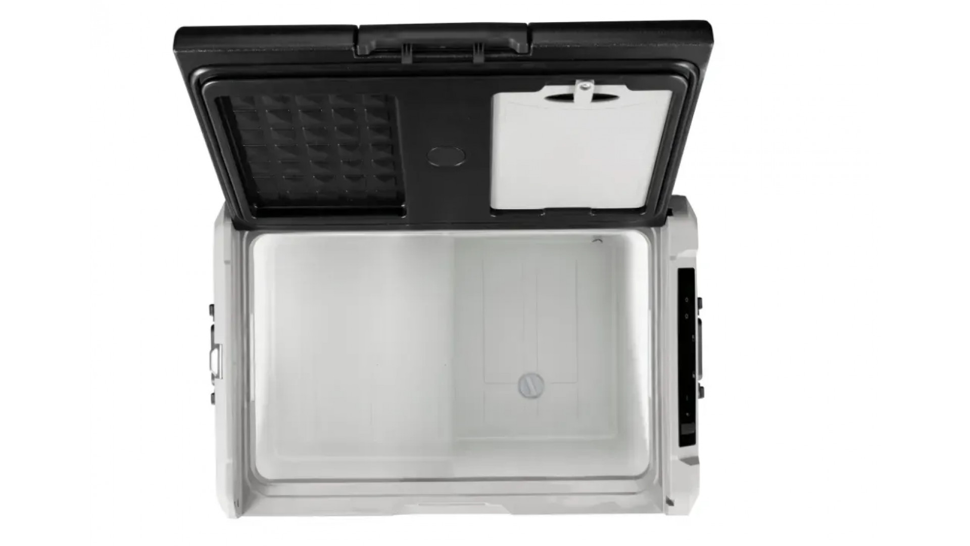На верхней панели — четыре подстаканника: можно поставить банку, бутылку или термокружку. Это удобно в пути, на стоянке или в кемпинге, когда холодильник используется как импровизированный столик.