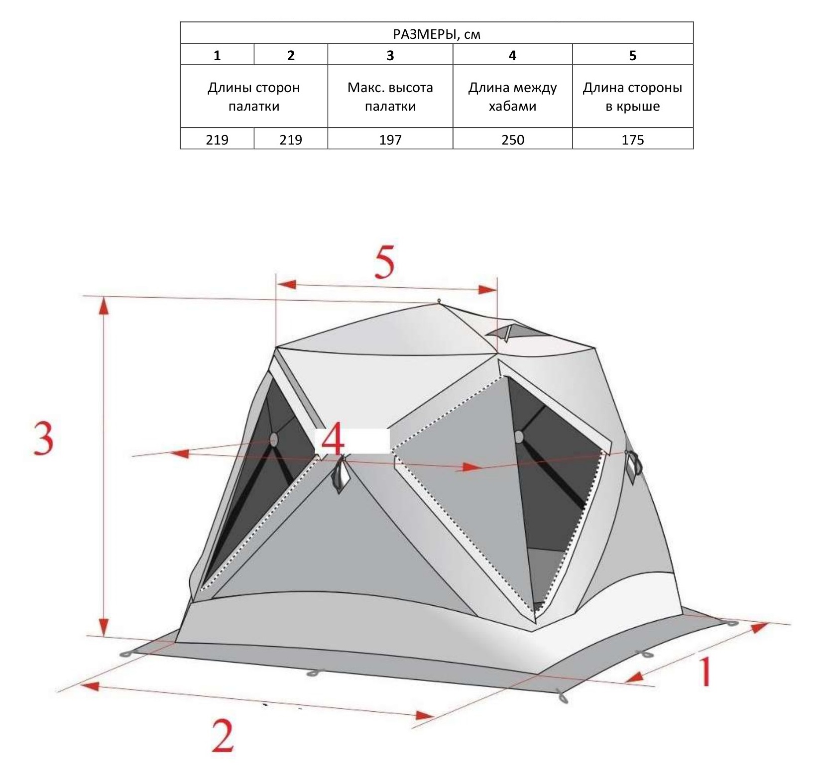 Модель Хигаши Пирамид Экстрим быстро собирается и разбирается благодаря конструкции хабов или другими словами «зонтичной». Внешние размеры палатки 230х230х200 сантиметров. сантиметров, внутренние 220х220х200. Форма квадрат. Более подробные размеры представлены в таблице справа.