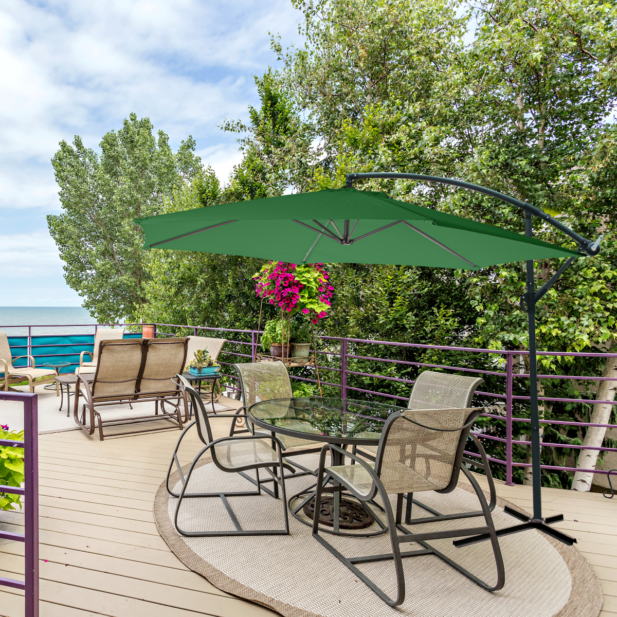 В комплекте с зонтом идет основание – крестовина, на которую для устойчивости можно установить бетонные утяжелители (в комплект не входят) или привернуть ее через имеющиеся отверстия к полу.