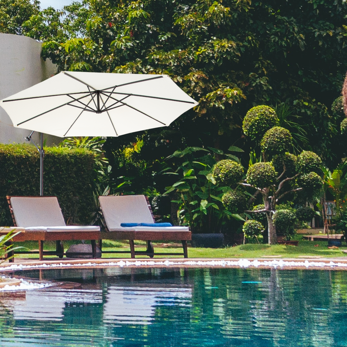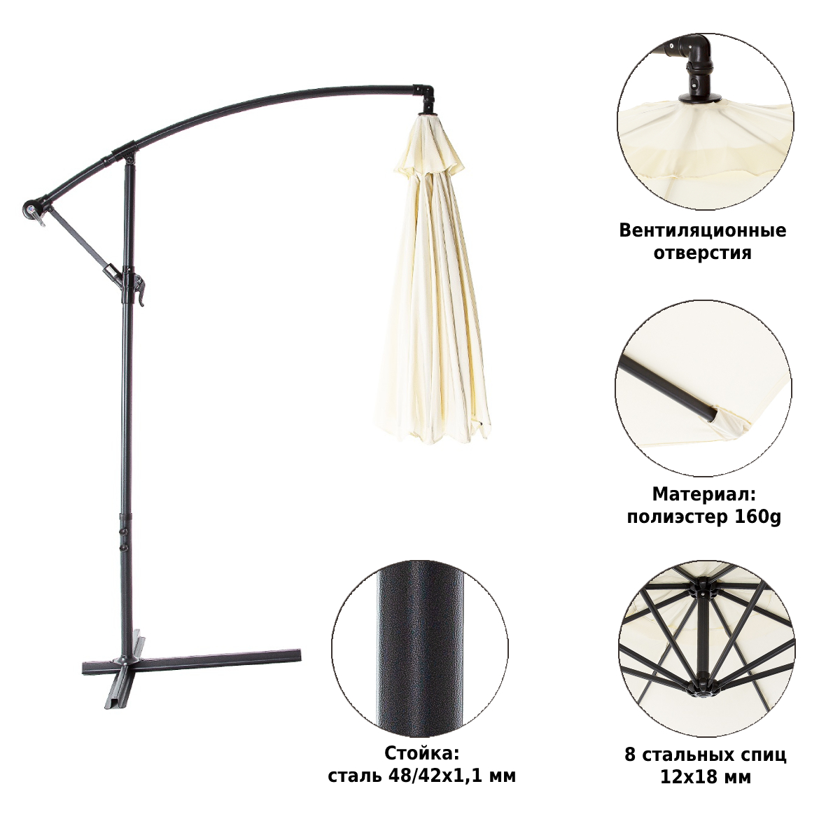 В комплекте с зонтом идет основание – крестовина, на которую для устойчивости можно установить бетонные утяжелители (в комплект не входят) или привернуть ее через имеющиеся отверстия к полу.